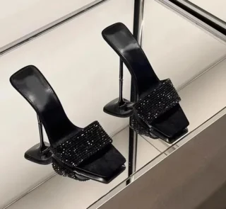 €5.45Peep Toe Rhinestones Lace Back Strap Sexy High Heels 2025 Size 35-40 Side Empty Party Sandals Pointed Toe Luxury Party Sandals