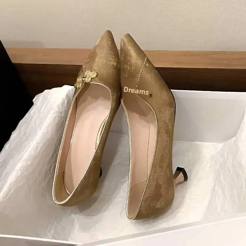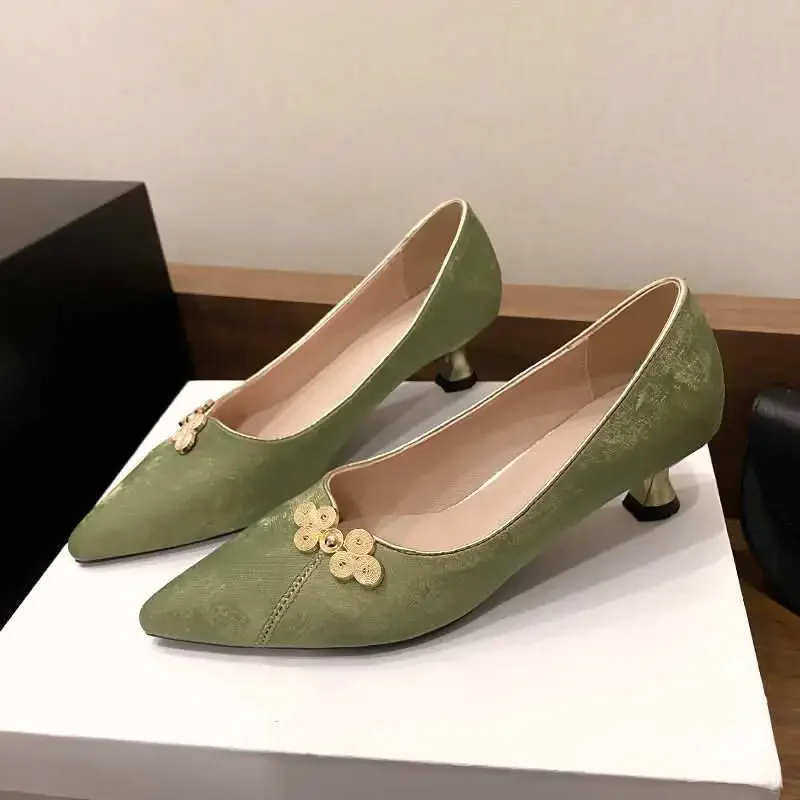 Elegant Chinese Style Women’s High Heels Thin Heel Satin Low Cut Shoes for Cheongsam Matched Small Heel Single Shoes