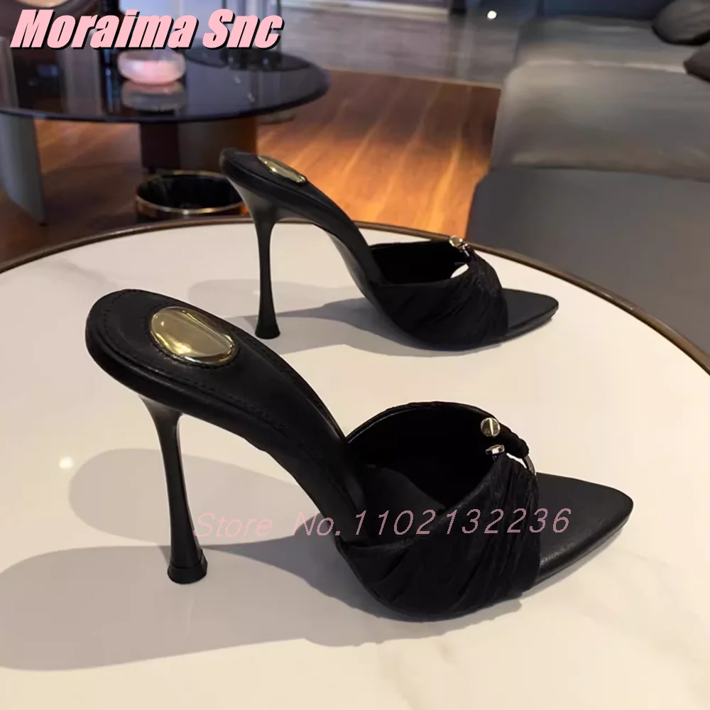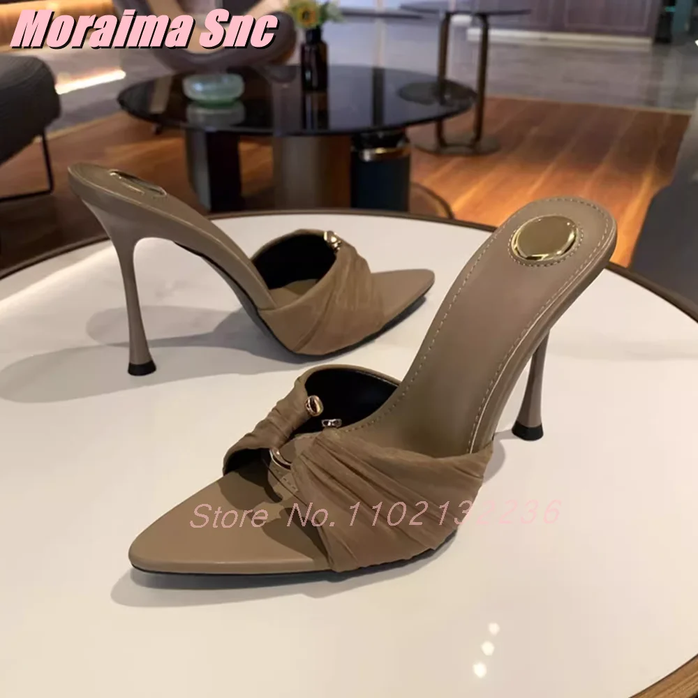 Metal Buckle Pointed Open Toe Mules Mesh Pleated Stiletto High Heel Slip On Nude Solid Sexy Fashion Women’s Summer Slippers 2025