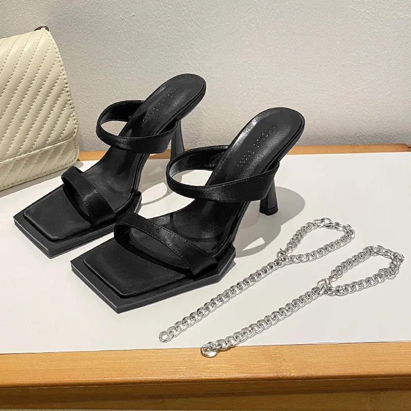 Open Toe High Heeled Sandals Women’s 2025 Summer Style New Square Head Thick Heels Mid-heel Slippers Sandals Women Shoes Black