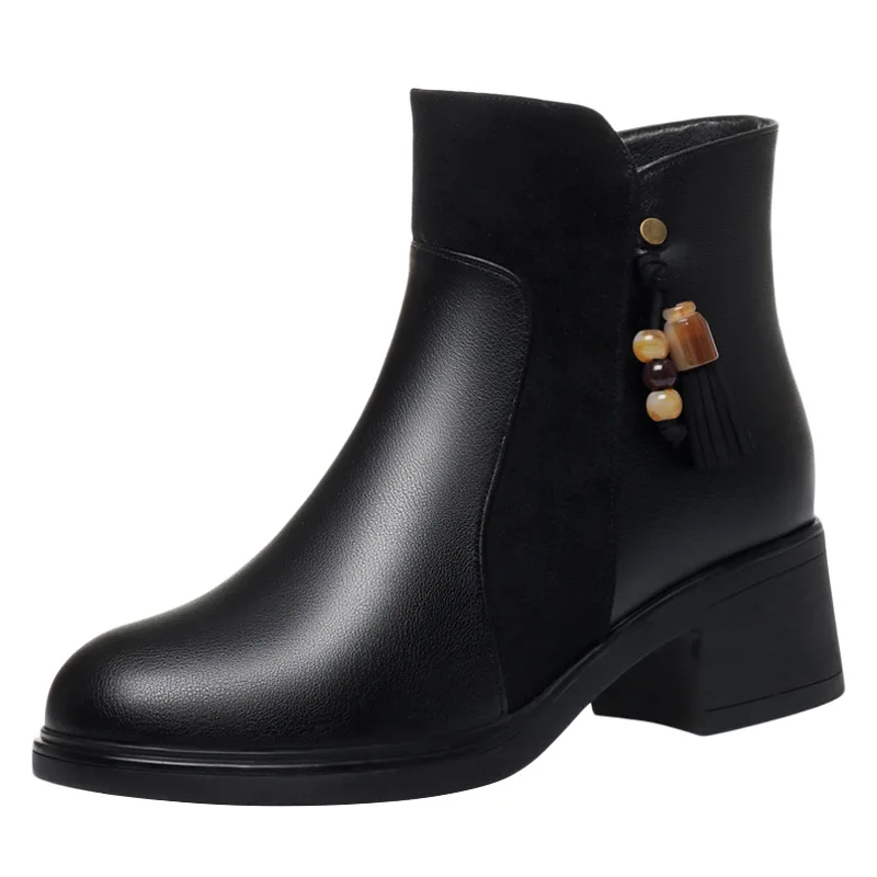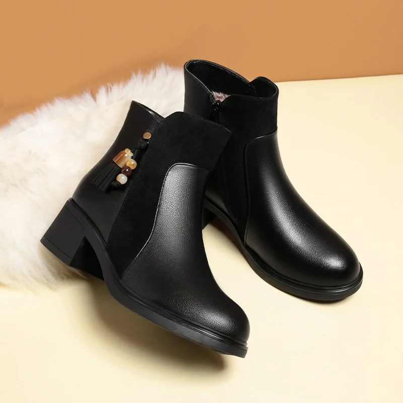 Crafted from premium split leather, these boots are waterproof and built to withstand cold winter conditions. The velvet lining and insole provide exceptional warmth and softness, keeping your feet cozy in chilly weather. Perfect for winter outings or urban wear, these leather ankle boots combine fashion, function, and comfort for the modern, confident woman.